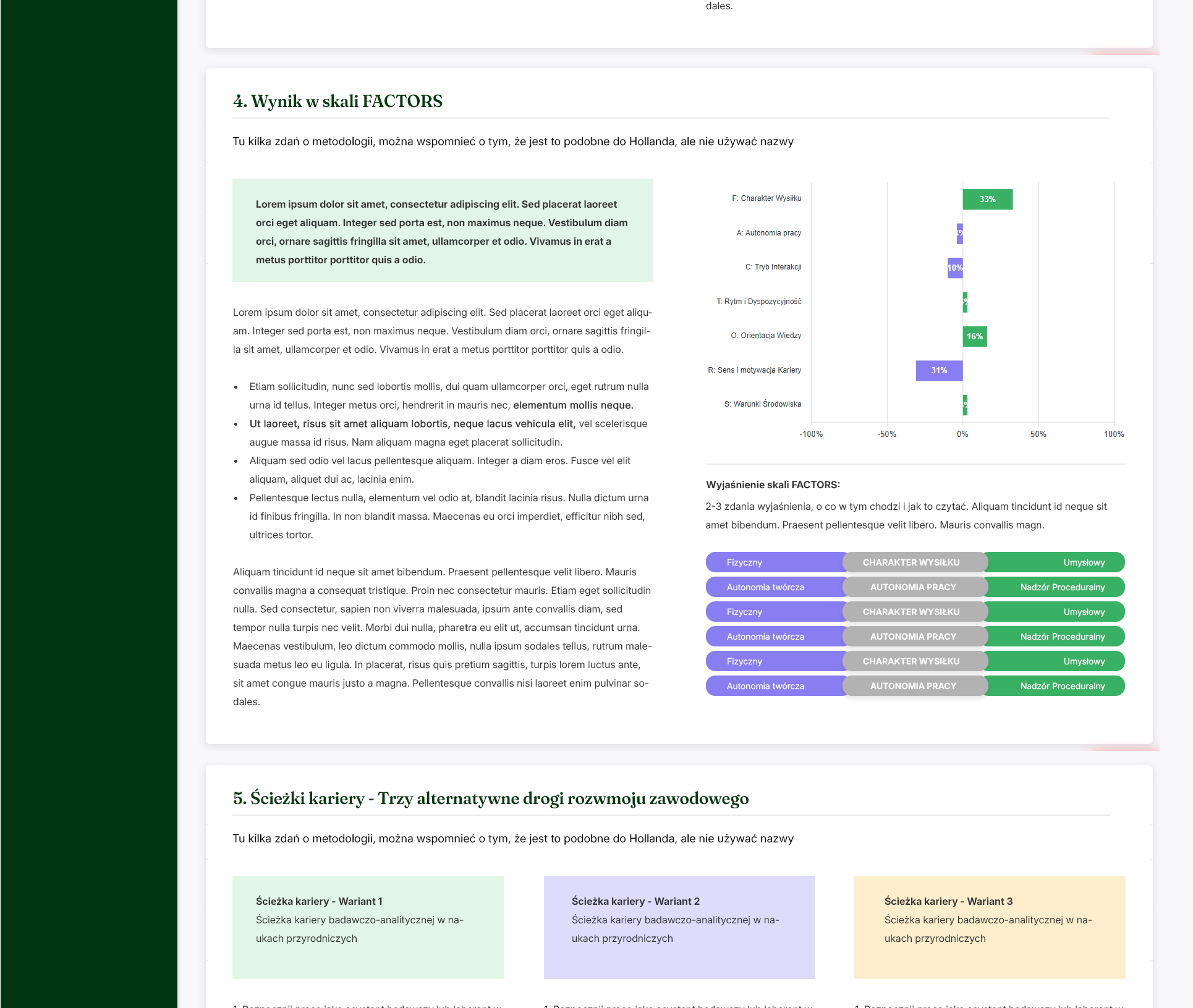 After completing the test, you receive a detailed analysis consisting of unique segments: personality trait analysis, main professional areas, suggested career paths, list of careers and anti-careers (directions better to avoid).